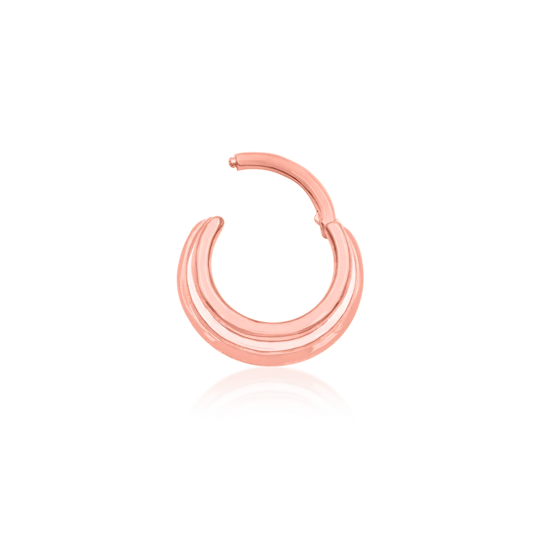 The 3 Stacked Rings Clicker piece is a luxurious clicker featuring 3 rings stacked together. The seam of the hinge is conveniently placed to not interfere with healing piercings.