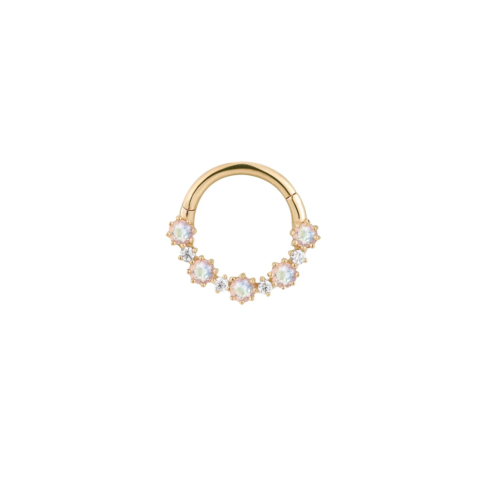 The Ariana clicker boasts eleven luminous and mystical rainbow moonstones, ready to shine on all your adventures. We love to style it with our other moonstone designs for a mesmerizing jewelry curation.