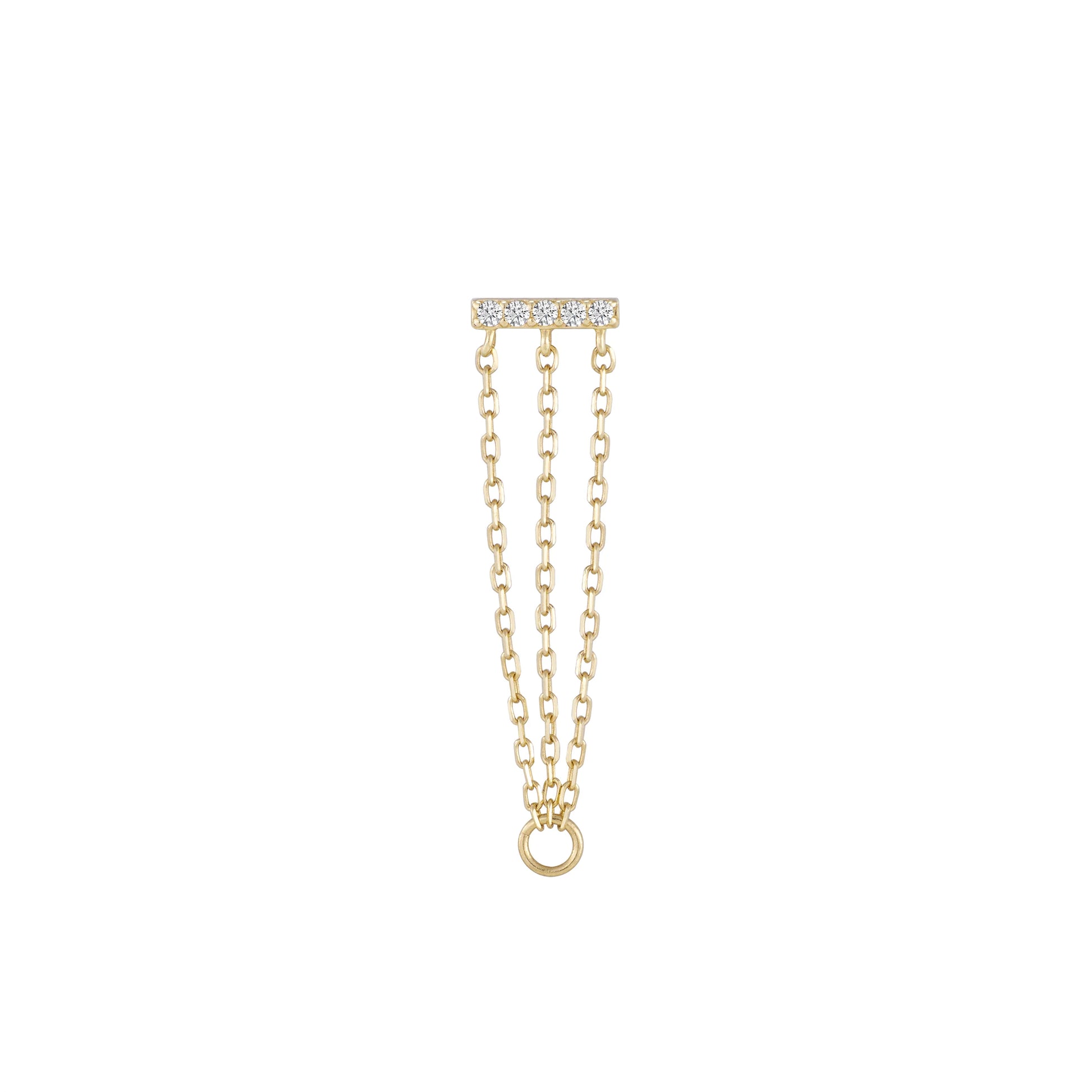 Chains aren't just for necklaces. Add Auralie to your curation for an elevated style. Delicately draped 14kt gold chains capped with sophisticated CZs. This threadless end features three elongated chains that connect a jump hoop with another threadless end, clicker, seam ring, or post.