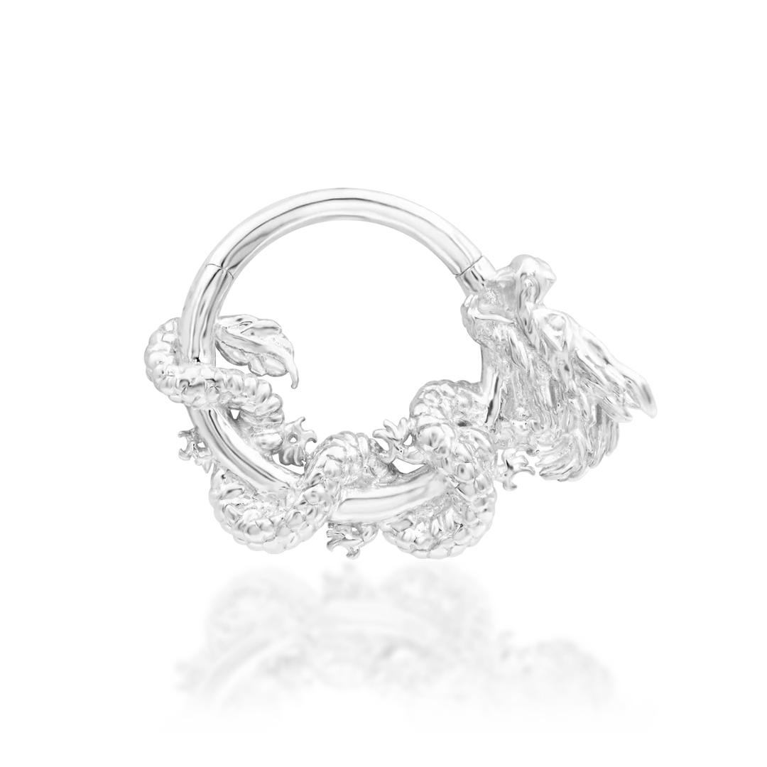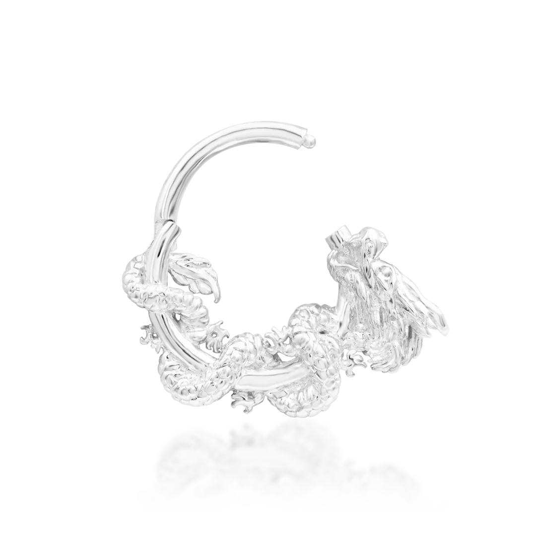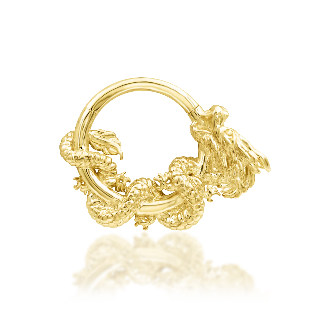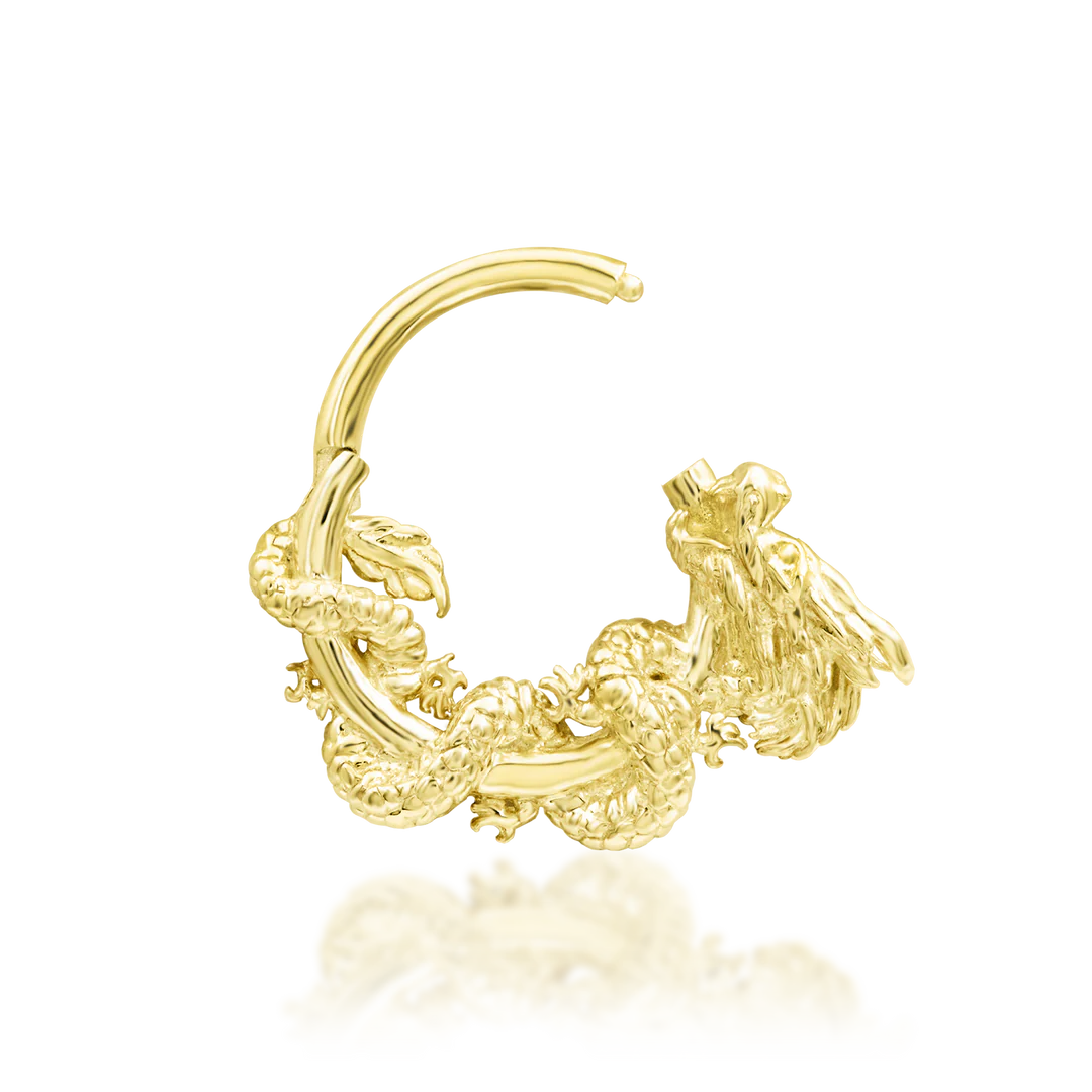 The Azure clicker ring showcases a unique dragon design wrapped around Junipurr's expertly made clicker rings, set in solid 14k gold. .