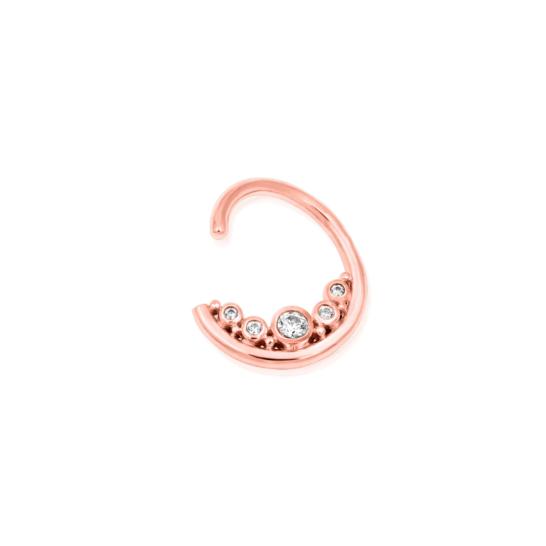 Baloo boasts a cool and blingy silhouette. Five bezel set stones sit on the inside of a sleek seam ring, with single beads dispersed throughout.