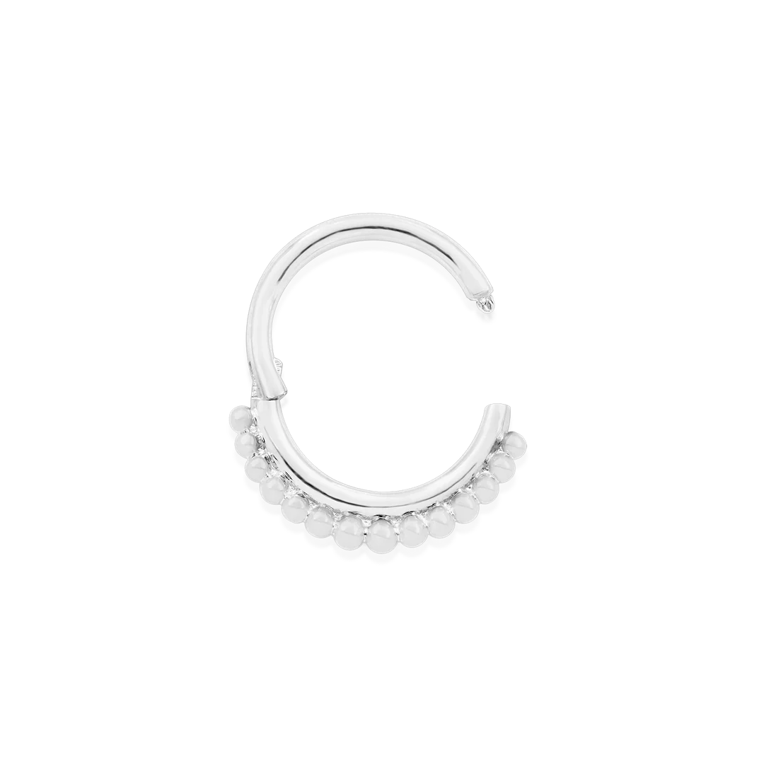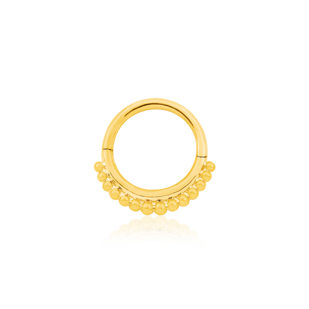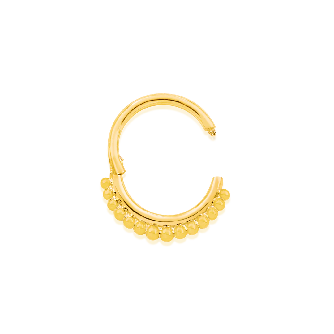 The Gold Beaded Clicker piece is a classic ring adorned by 14 finely detailed beads. The seam of the hinge is conveniently placed to not interfere with healing piercings.