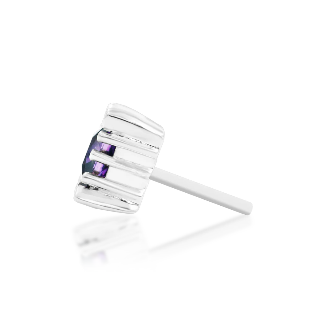 Featuring a captivating square-cut design, adorned with an otherworldly Synthetic Amethyst Cubic Zirconia stone and framed in a 14k prong-set.