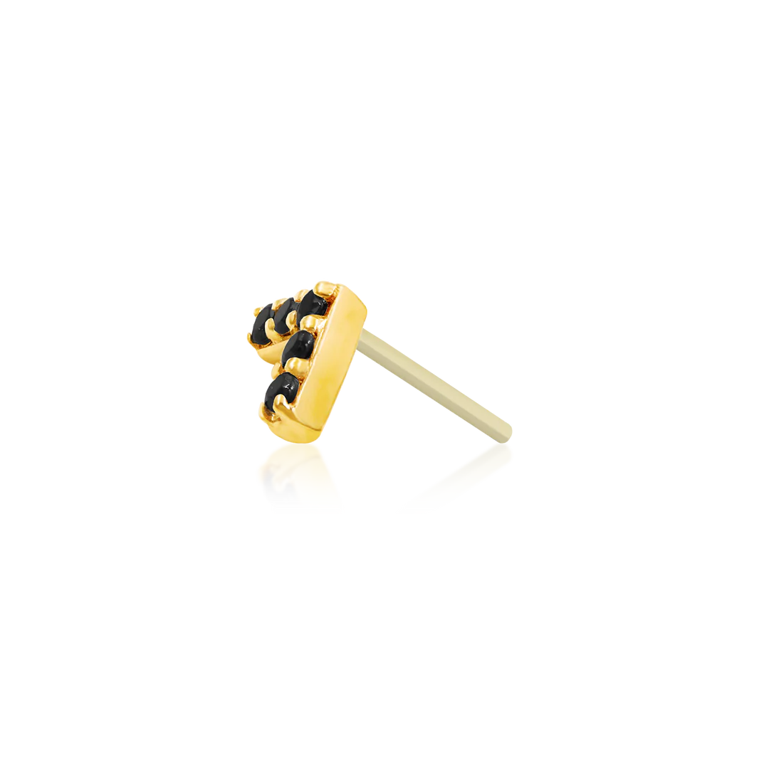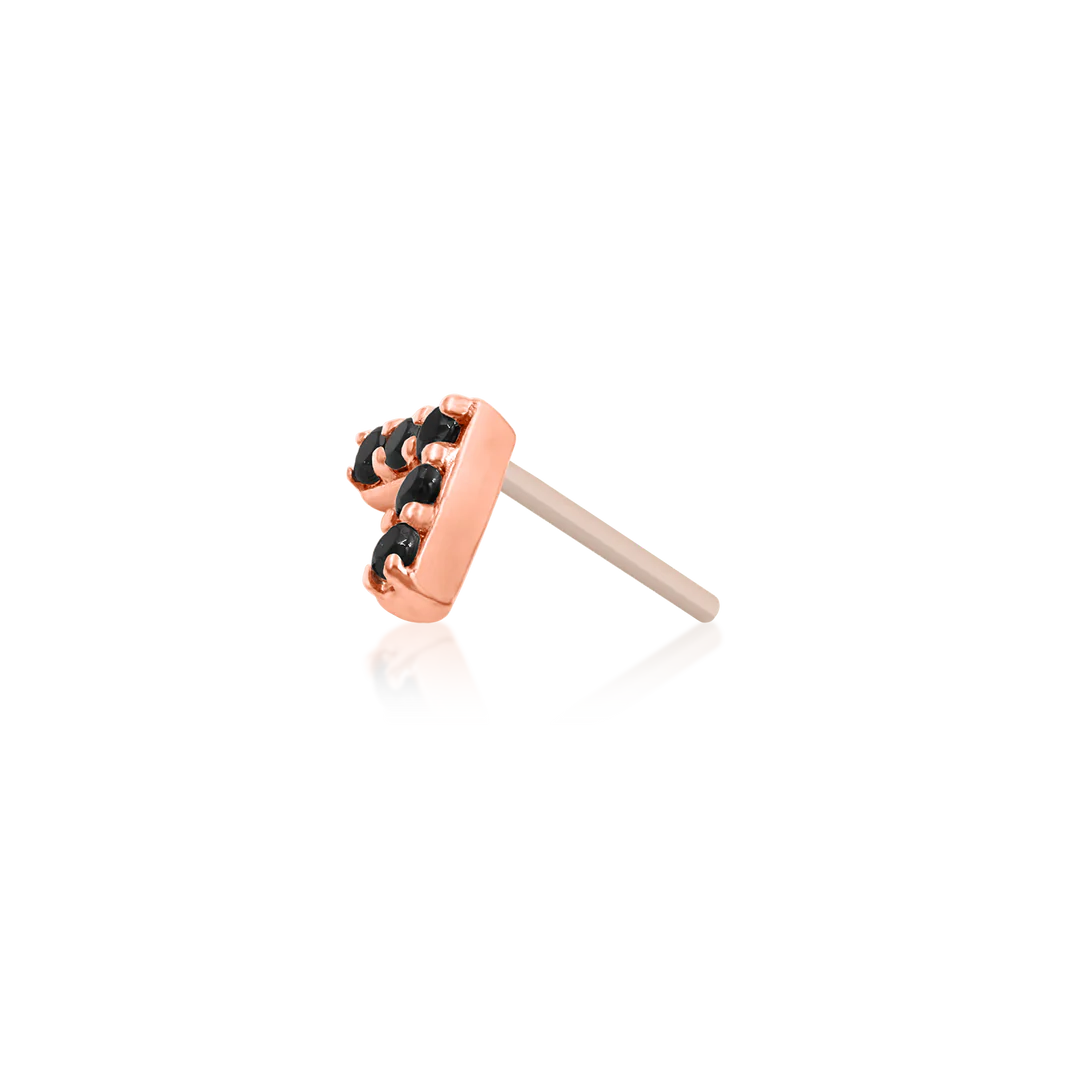 The Chevron with Black Cubic Zirconia piece is pitch black in color and is completely opaque. This sleek, contemporary design features 5 gemstones with 1mm diameter lined in a bold, geometric chevron shape.