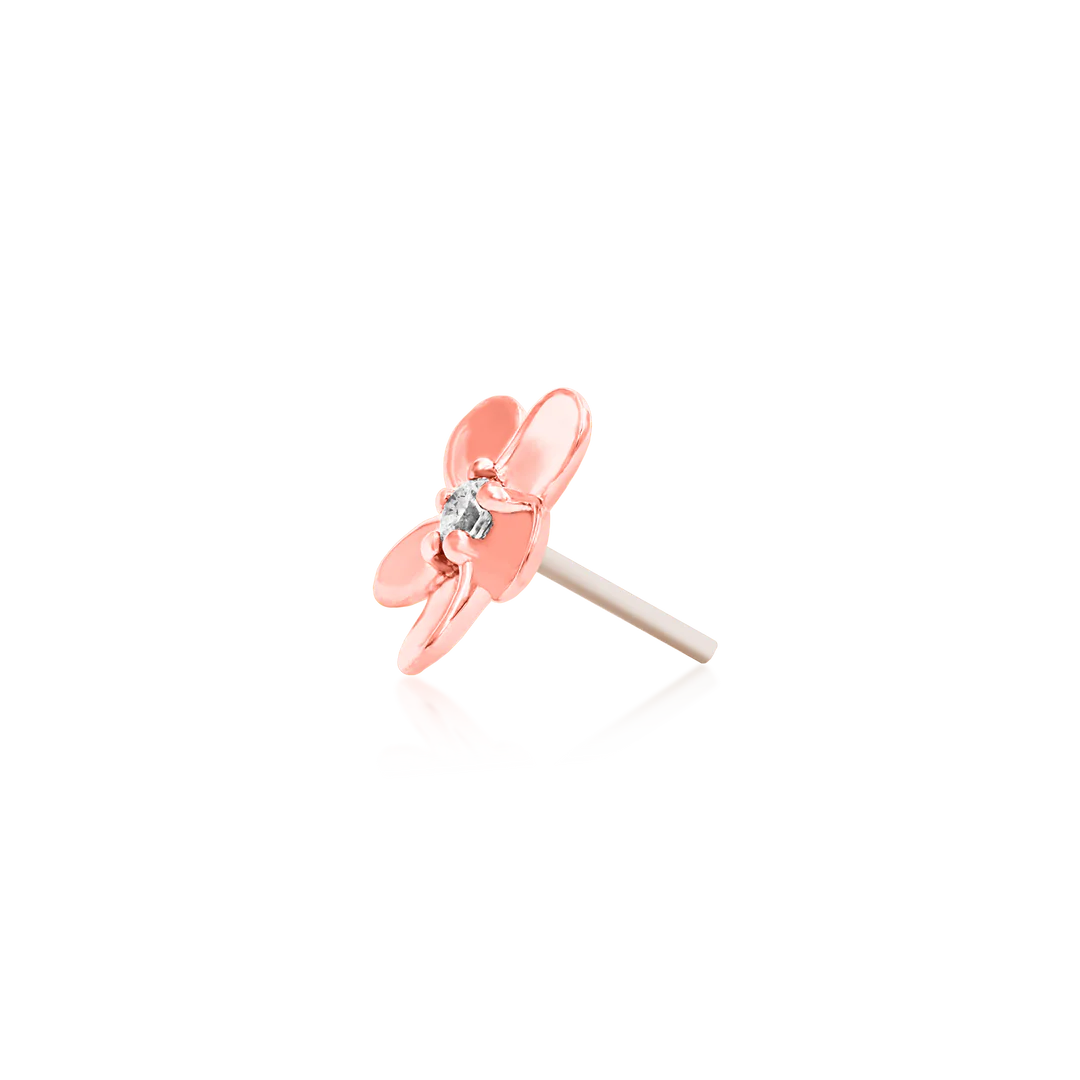 The Gold Flower with Cubic Zirconia is flower-shaped featuring a central 1mm gemstone that adds an extra sparkle to the shiny gold leaves.