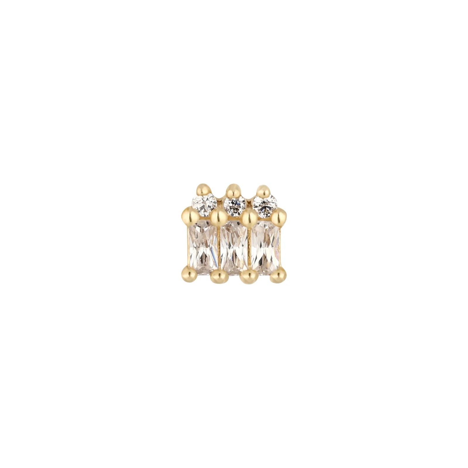 The more dazzle, the better- Excess is the dimensional cutie you never knew you needed! Three CZs lay vertically side by side with a symmetrical set of three Swarovski CZs on top, delivering ultimate balance in the piece. Style beautifully in ear piercings like your earlobes, helix, flat, tragus, or conch.
