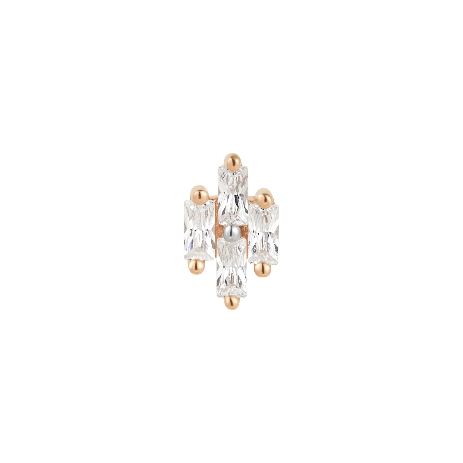 Modest in size and maximal in sparkle factor—Fate is here to fulfill anyone's whimsical winter aesthetic! Adorned with 4 CZs, this bright piece stands out from any other design we've released. It introduces a new concept with a white gold prong at the center, enhancing the overall brightness of the design.