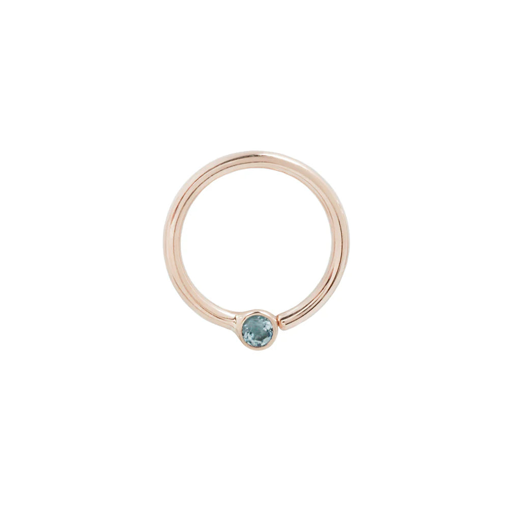 Dive into deep blues with the dreamy solid 14k gold fixed bead ring, adorned with a 2mm bezel-set London Blue Topaz gemstone. This piece is a go-to for initial piercings like the septum, daith, or helix. Snag one in just the right size to complement your unique anatomy!