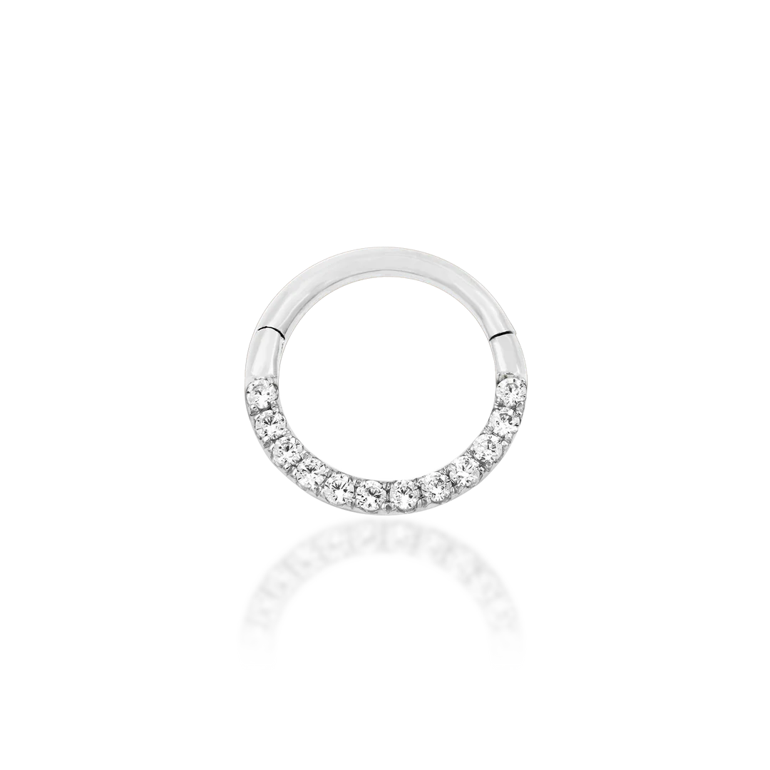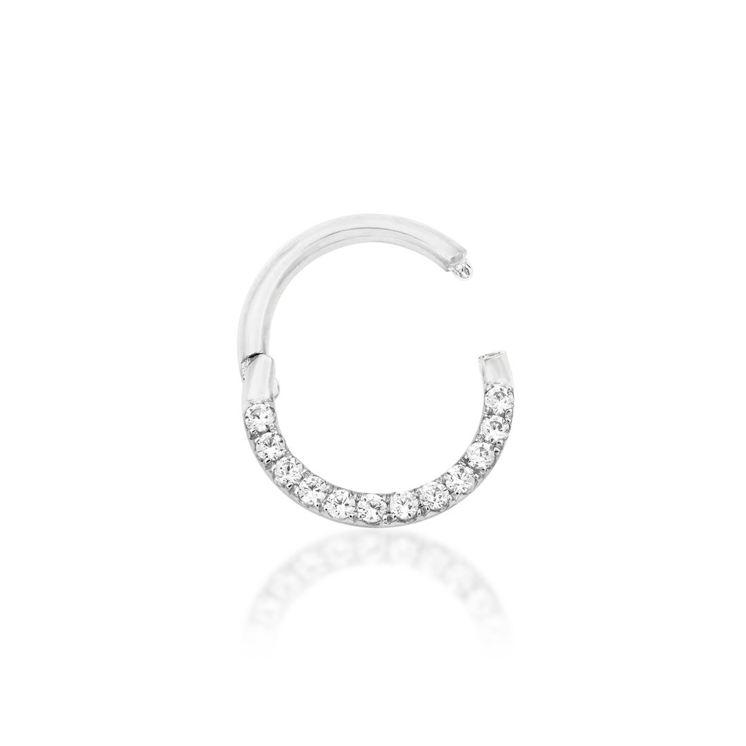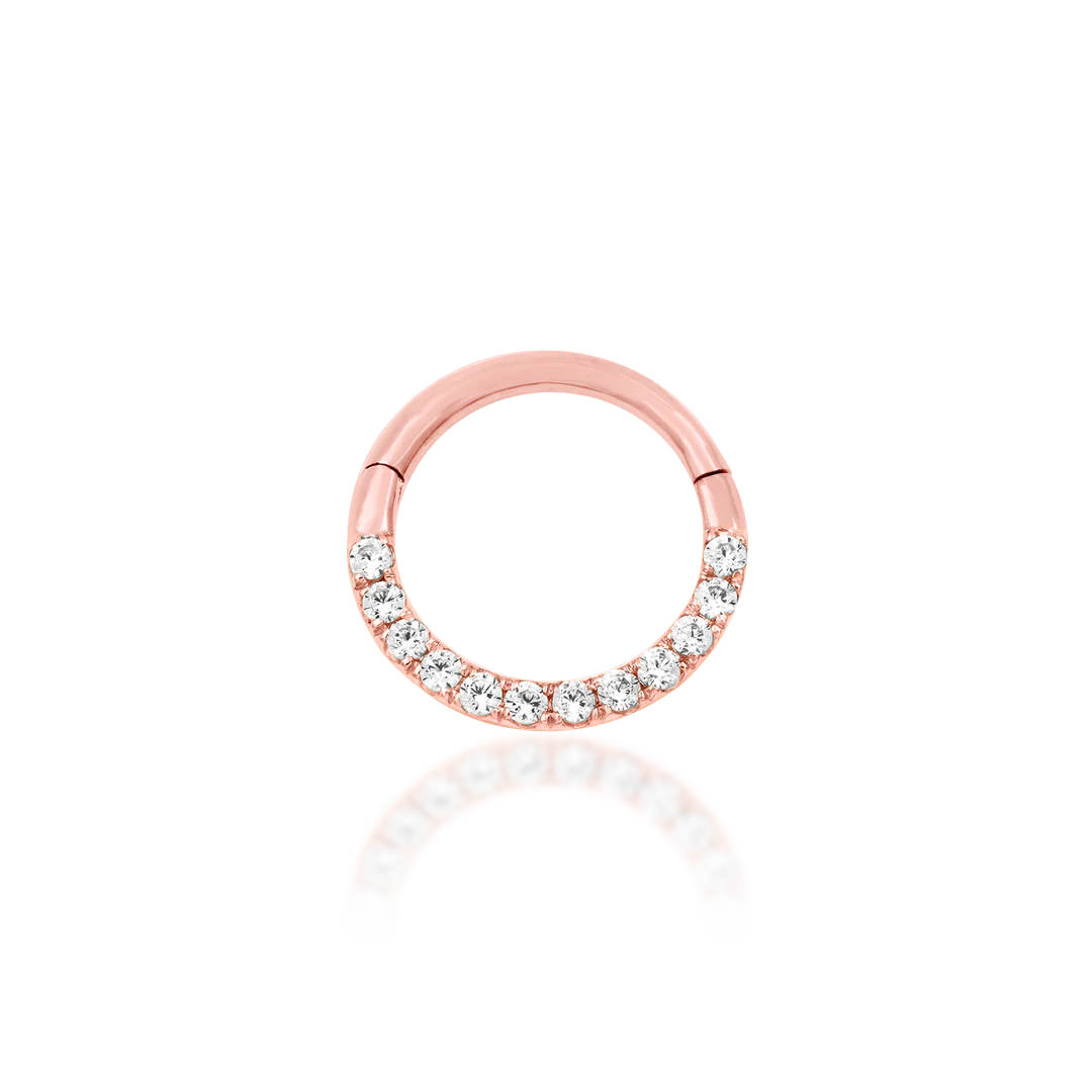 The Gold Cubic Zirconia Clicker piece is a classic ring featuring a continuous row of 1mm clear gems. The seam of the hinge is conveniently placed to not interfere with healing piercings.