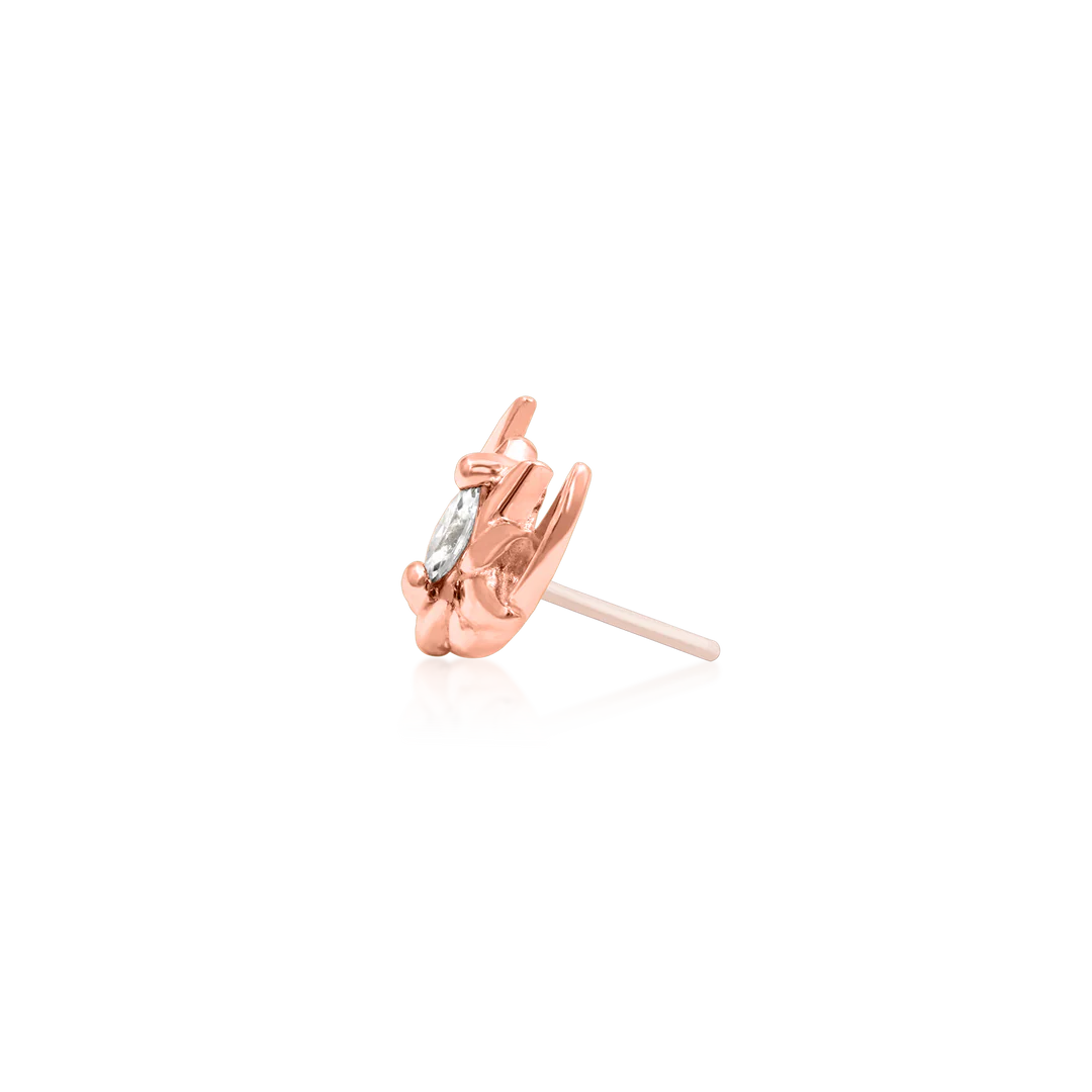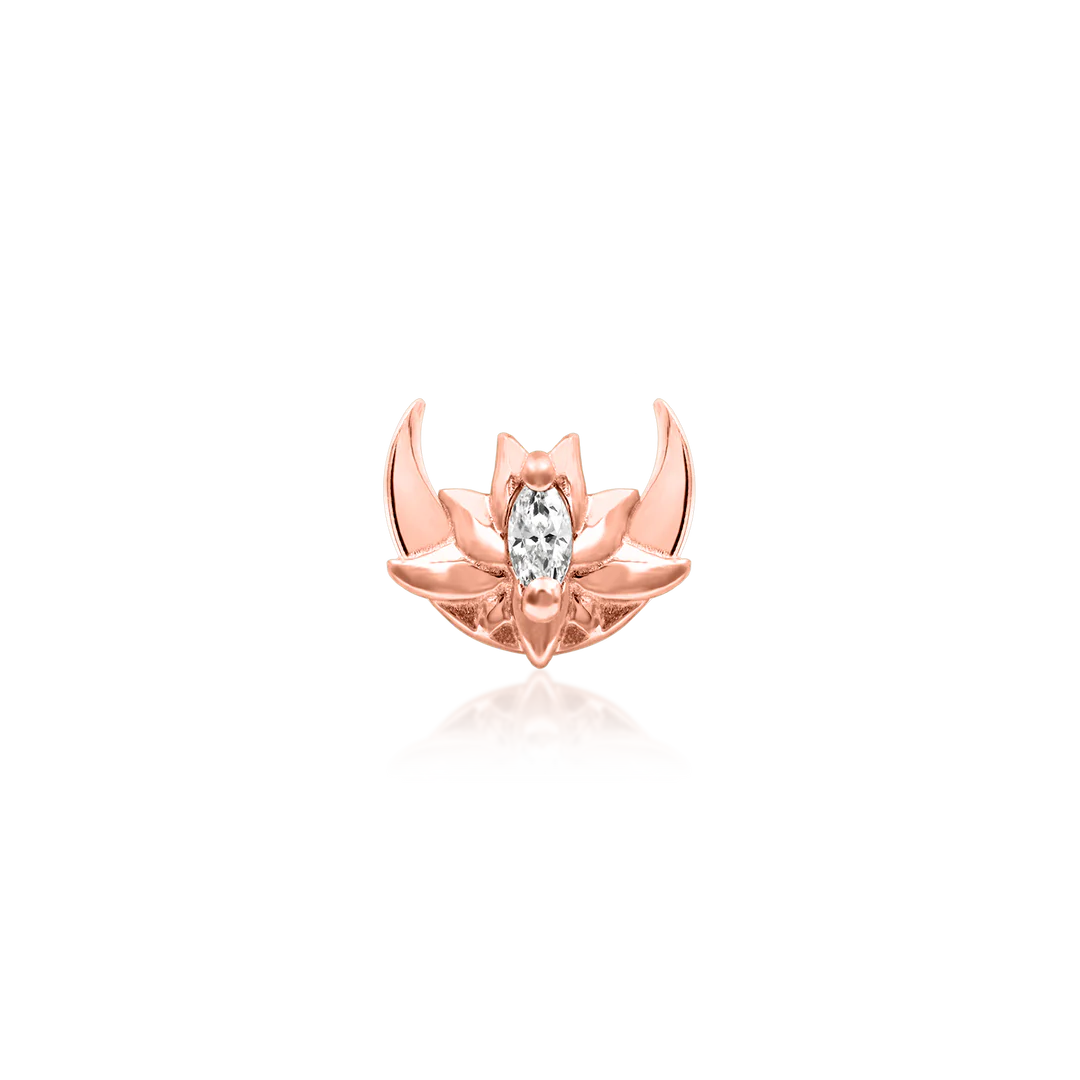 Gift yourself the best with the third and final piece in Junipurr's Guardian Series, the Guardian Moon threadless end. Guardian Moon has an elegant marquise cut cubic zirconia set amongst a fully blossomed flower, held by a beautiful moon silhouette.