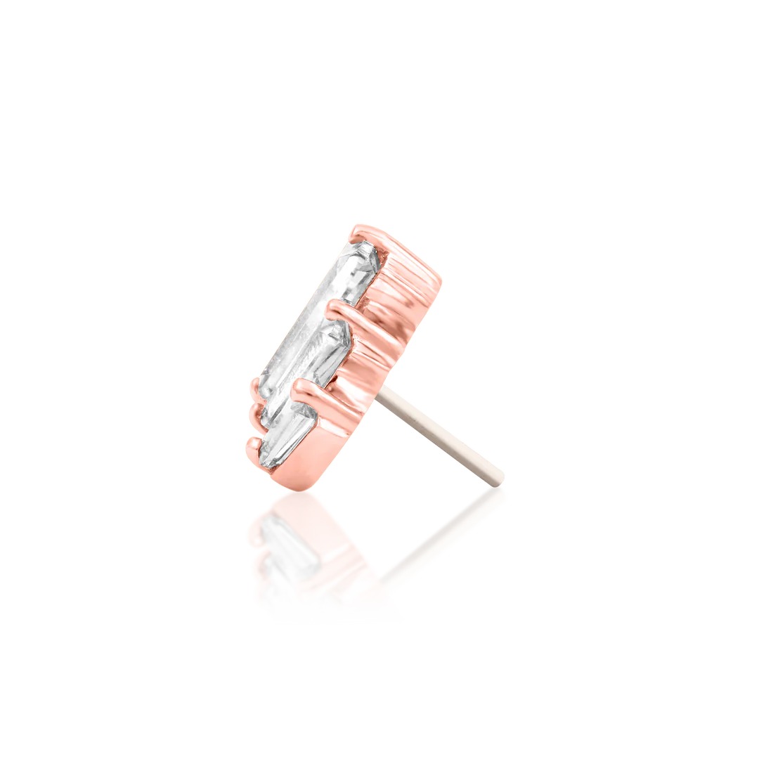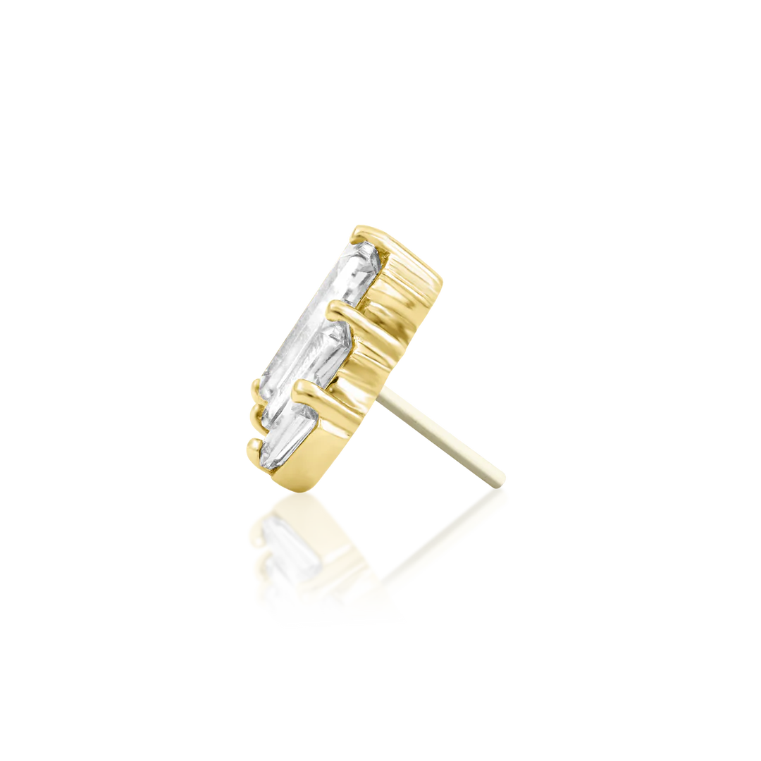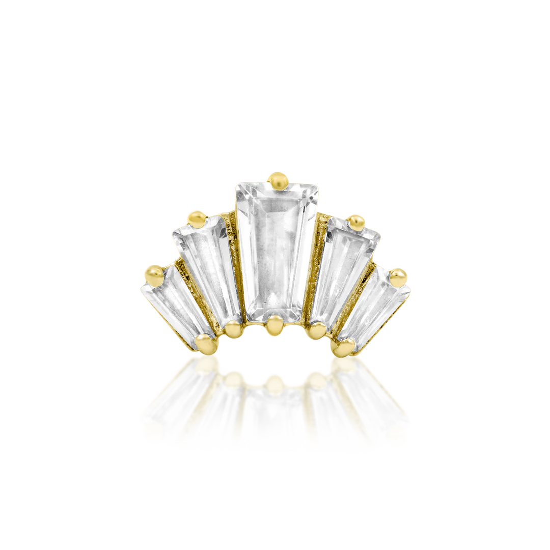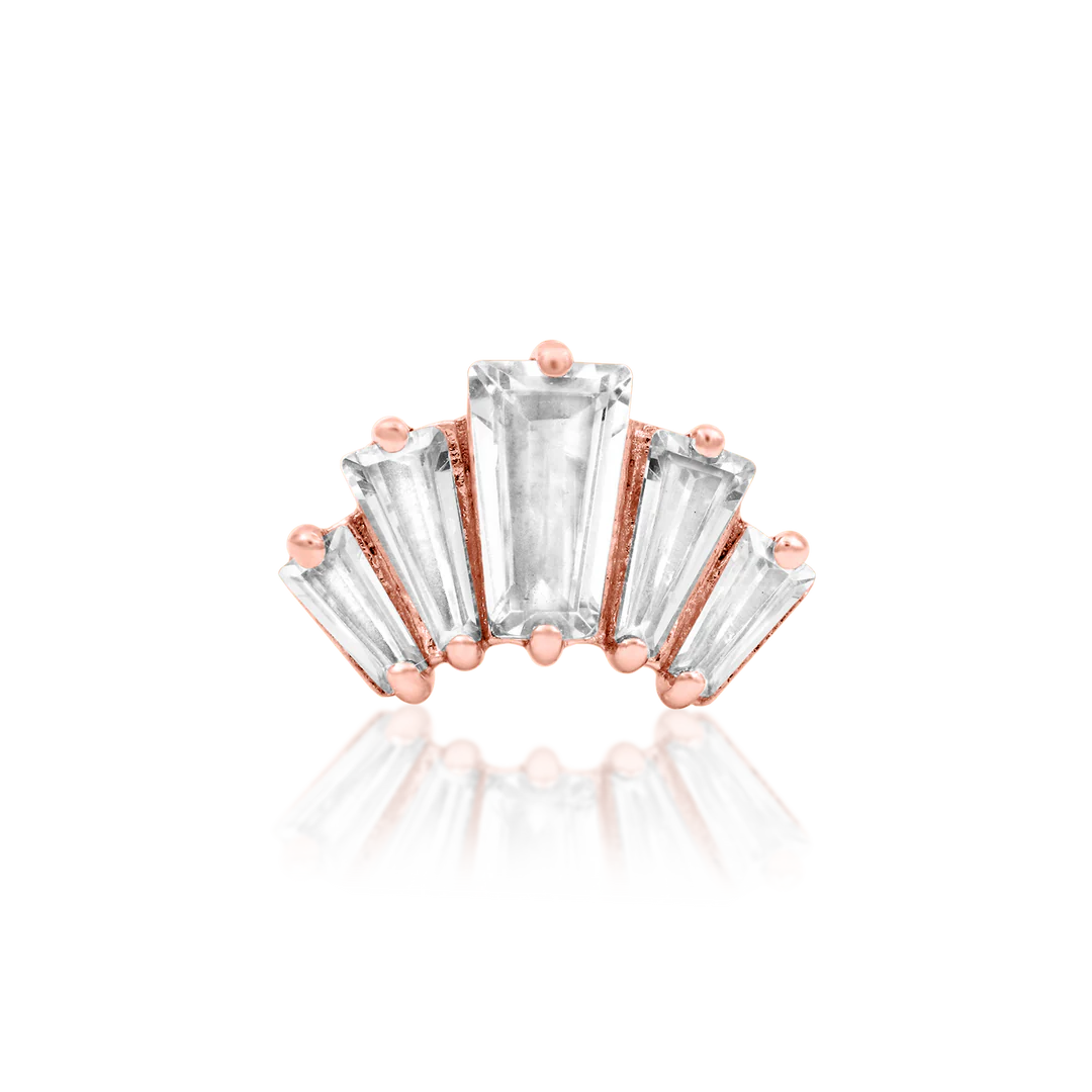 A chorus of 5 super sparkling baguette-cut CZs (5x3x2mm, 4x2x1mm x2, 3x1.5x1mm x2), mounted on a 14k beaded prong side setting.
