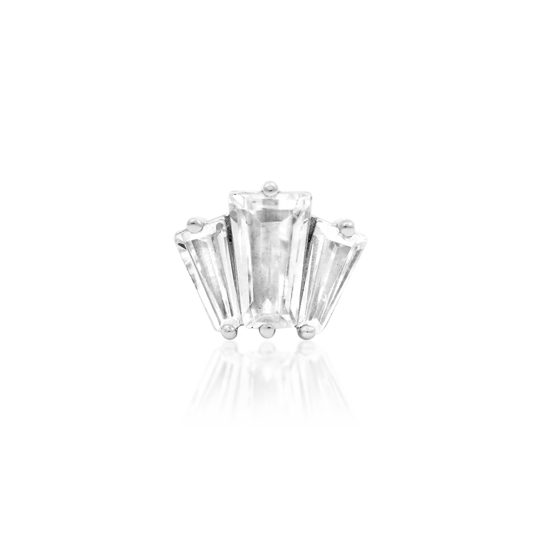 A chorus of 3 super sparkling baguette cut CZs ( 5x3x2mm, 4x2x1mm x2), mounted on a 14k beaded prong side setting.