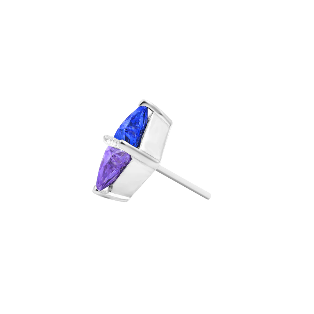 It has two 3x3mm triangle gems, one Trillion Cut Synthetic Purple Corundum and one Trillion Cut Tanzanite Cubic Zirconia, lovingly mounted on a 14k setting.