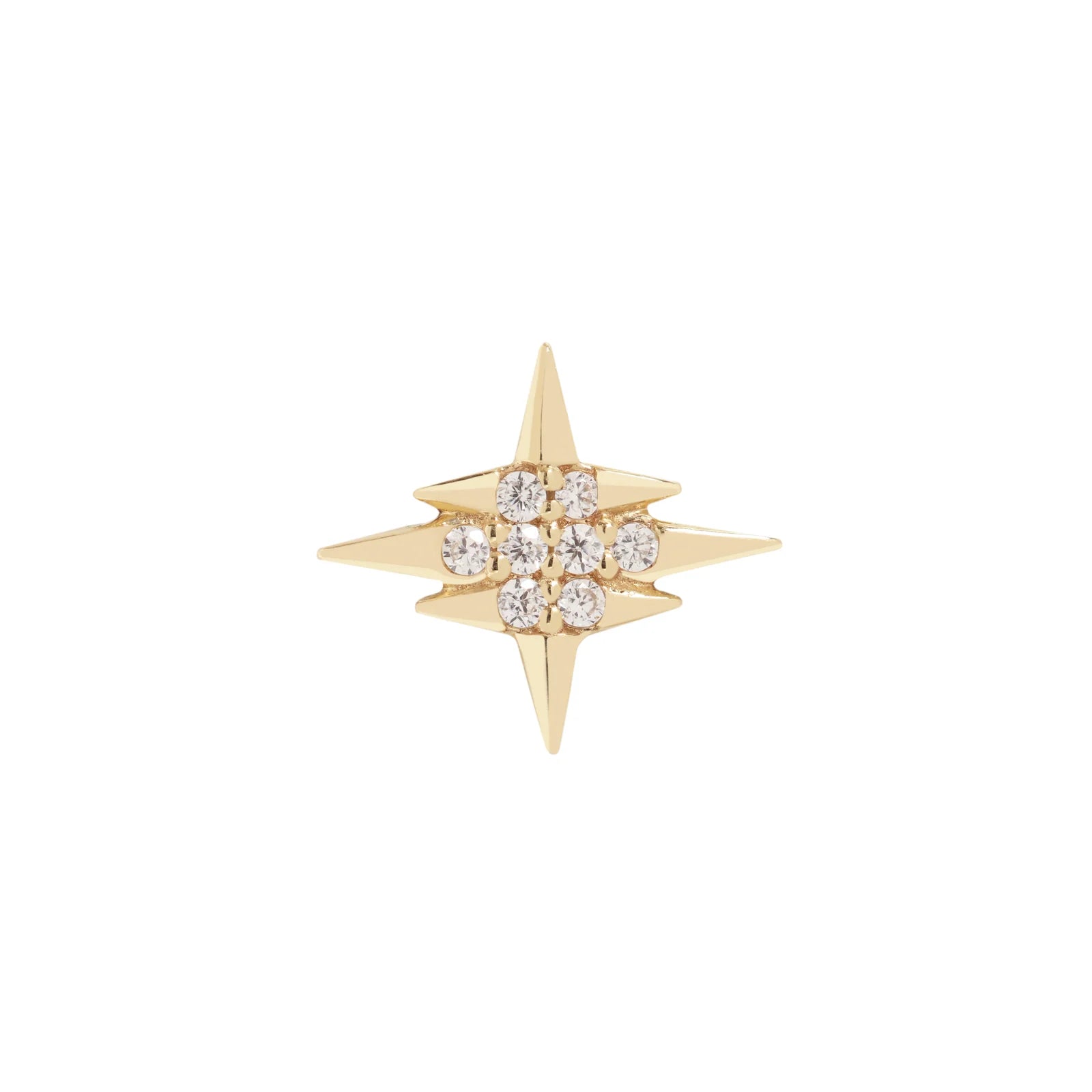 The Intergalactic threadless end is a cosmic stunner, with round CZs forming a dazzling starburst. Perfect for adding a touch of celestial shine to your nostril, lobe, rook, helix, flat, philtrum, and labret piercings.