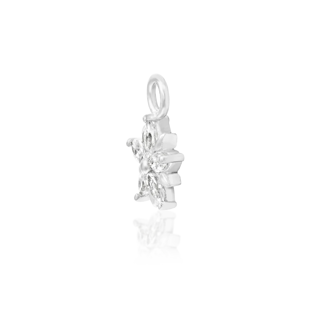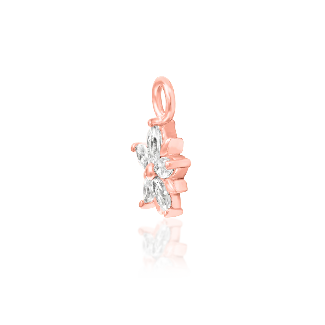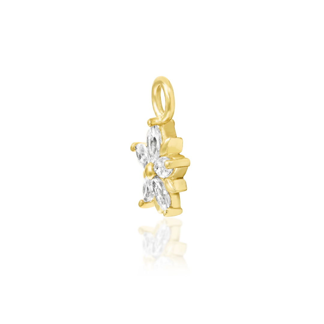 Kira is a sparkling bloom charm of 3x1.5mm x5 Marquis CZs, brought together on a solid gold prong setting and dangled from a jump ring. Hang from your favorite ring or pair with any body jewelry.