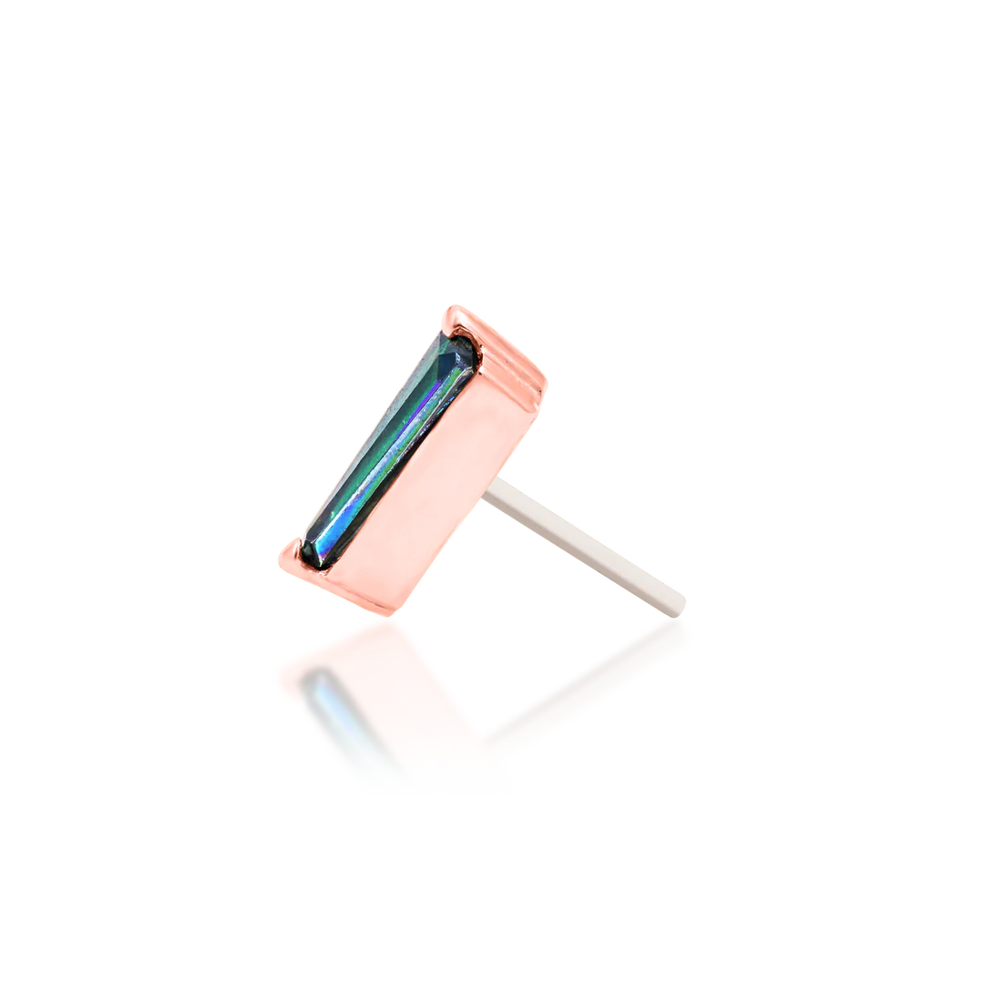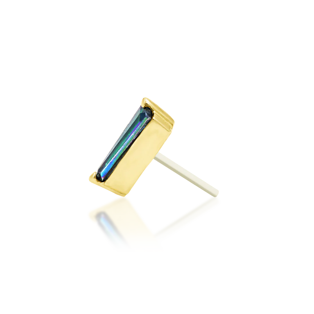 A classic baguette prong setting featuring Junipurr's new mystic topaz option, hues of purple and green add an earthy twist to a classic favorite.