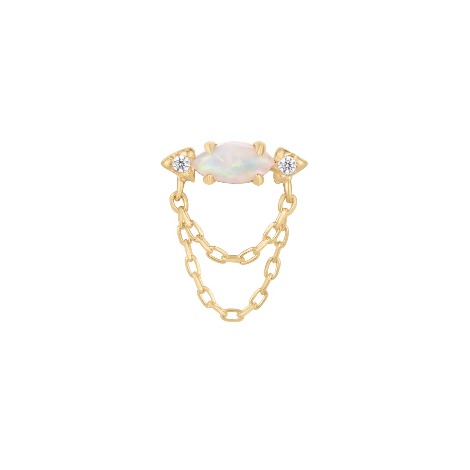 Discover the ultimate in elegance with the Limitless Opal and CZ Threadless End. This extraordinary piece features a stunning Australian opal at its center, framed by sparkling CZ, and is adorned with two delicate chains that drape gracefully beneath, creating a truly unique and eye-catching accessory.