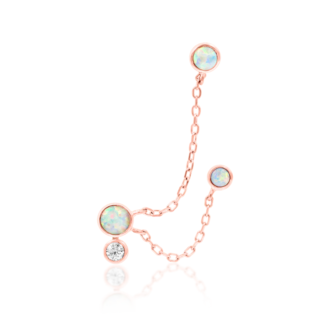 3 separate ends, a single 2mm CZ, and three Opals (3mm, 2.5mm and 2mm) and a pair of dangling delicate chains bring everything together.