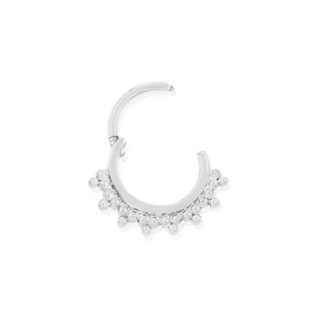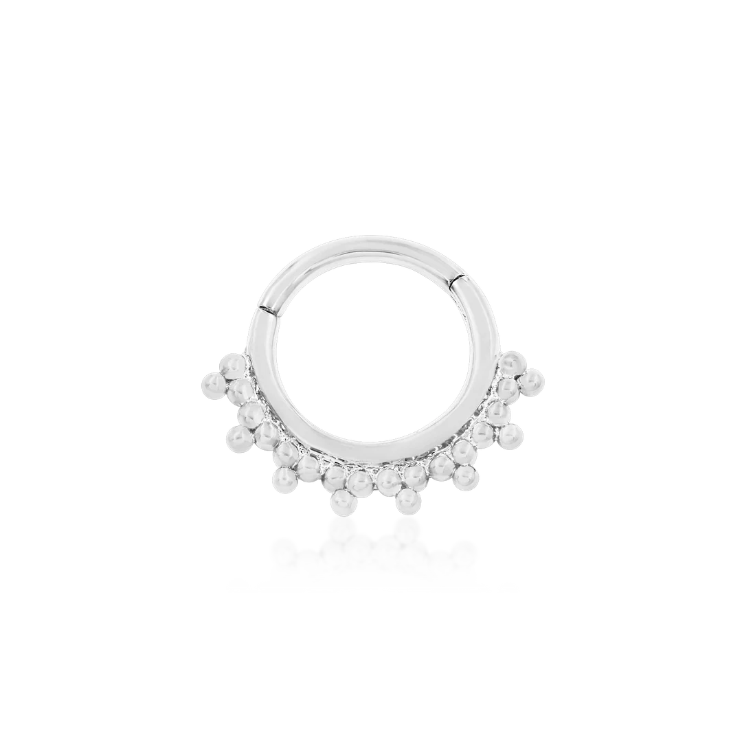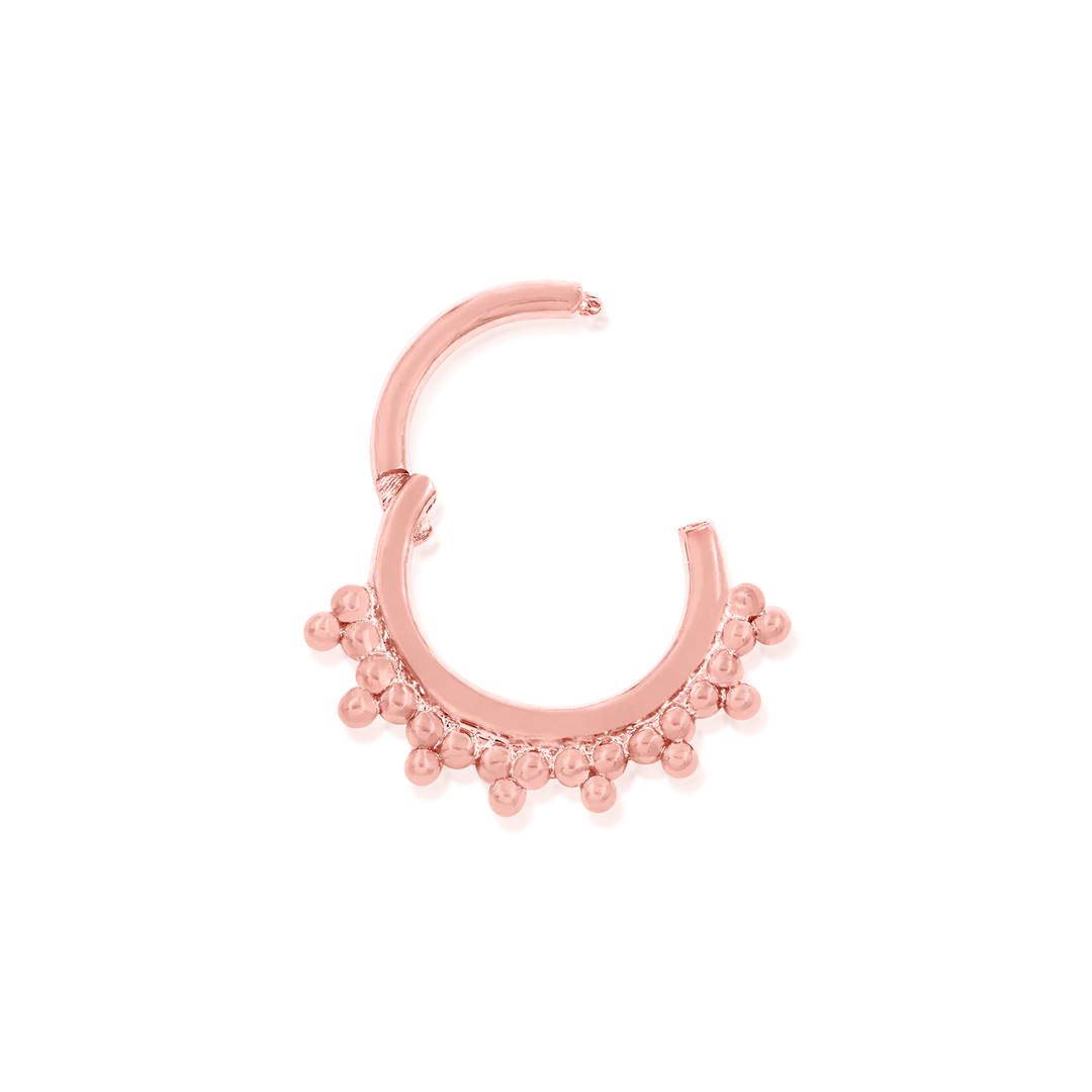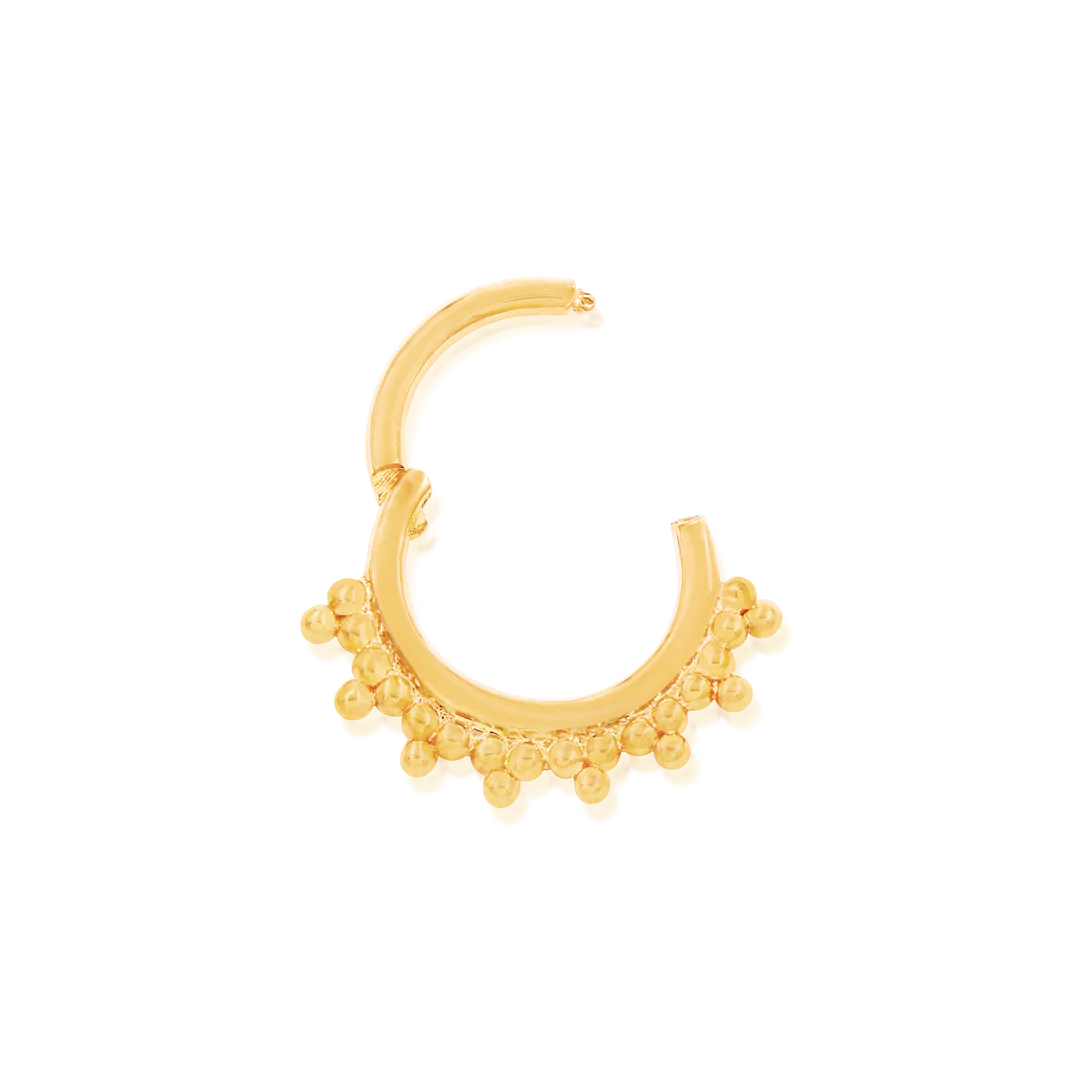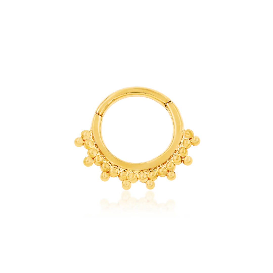 The Gold Tri-Bead Clicker piece is a classic ring adorned by 24 finely detailed beadwork in triangular formations. The seam of the hinge is conveniently placed to not interfere with healing piercings.