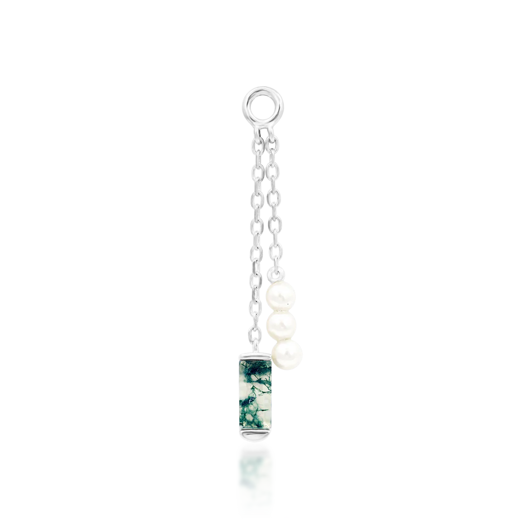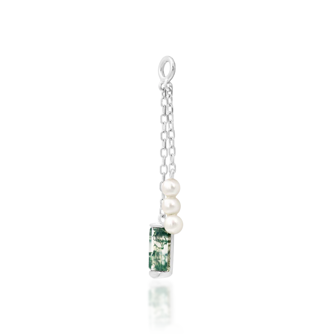 A genuine moss agate baguette and a set of 3 freshwater pearls, dangling from 10 & 15 mm drop chains.